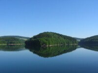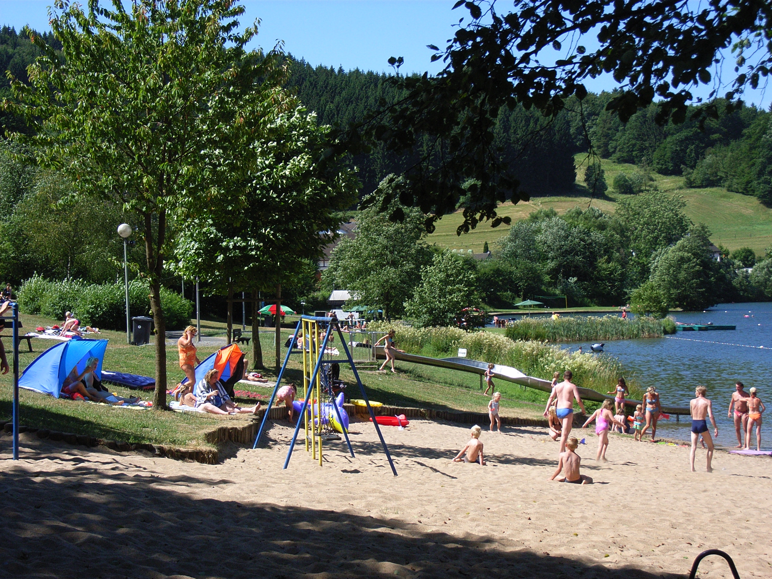 Das Naturbad liegt am Vorstau der Aggertalsperre, bietet eine große Liegewiese und einen kleinen Sandstrand am Kinderbecken.